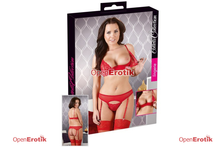 BH mit abknöpfbaren Spitzencups und zwei Paar Trägern. Ein Paar abnehmbar, das andere verstellbar. Hinten Hakenverschluss. Die leicht gefüttertern Cups sind mit einer Hebe unterlegt. String mit abknöpfbarem Spitzenteil vorn und hinten. Mit vier verstell- und abnehmbaren Strapshaltern. Rot. 90% Polyamid, 10% Elasthan.