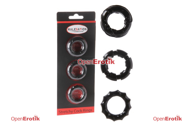 3 Stretchy Cock Rings mit verschiedenen Strukturen! Innovatives und ergonomisches Design, weich, hygienisch, blasenfrei, geruchlos, langlebig, einfach zu reinigen, Phthalat-frei. Material: TPE, Ø 2,5cm.